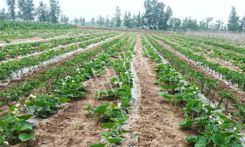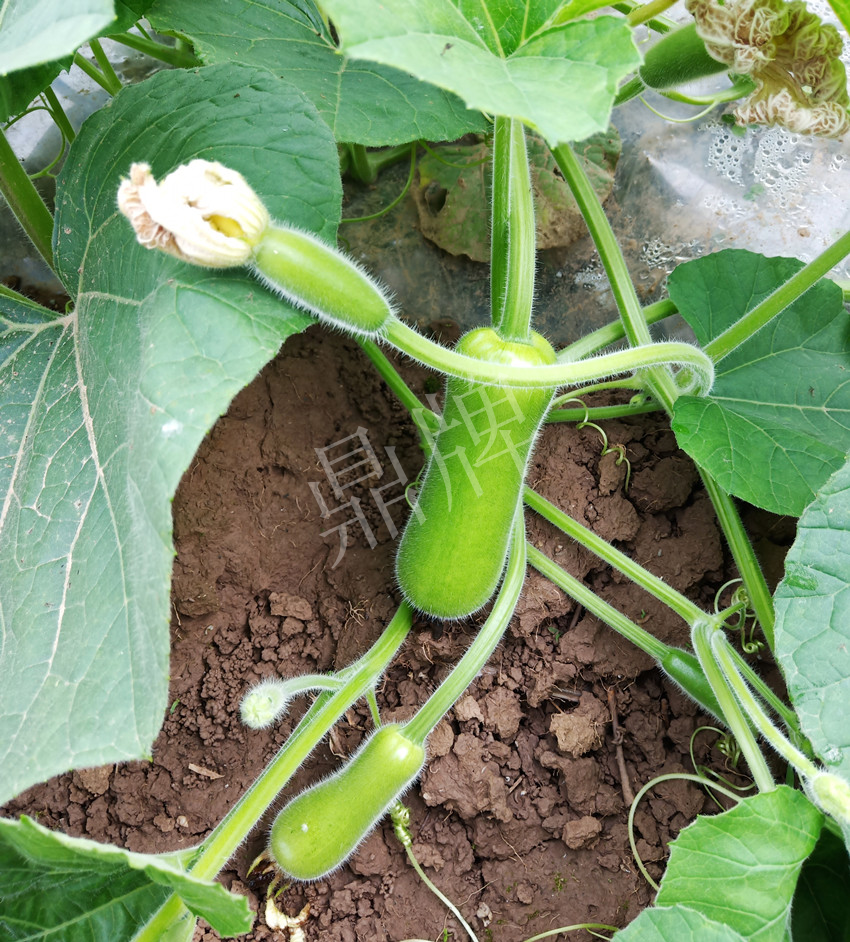 今年示范的新品種是“春棚如意”瓠瓜??炊ε铺峁┑馁Y料說明,是一個極早熟品種,前期坐果特別集中,這樣的品種正是我喜歡的,可以搶早賣上好價錢。因大棚安排滿了(大棚內(nèi)主要安排的是鼎牌絲瓜“優(yōu)比1號”、鼎牌甜瓜“玉奶香2號”、鼎牌南瓜“小胖墩”),所以,我在大棚只種了5分地的“春棚如意”瓠瓜,在露地種了1畝5分地,為了減少成本和勞動力,我在露地采用爬地栽培。