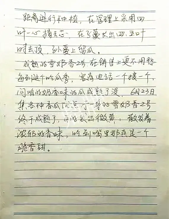 我今年種植的是鼎牌公司2023年推出的新品種雪奶香2號(hào),雪奶香2號(hào)是1號(hào)的升級(jí)版,肉更厚、更甜的新品種。我們這里都是麥田套種,采用行距1.9米,株距七十公分的距離進(jìn)行種植,在管理上采用四葉一心摘去芯,在子蔓長(zhǎng)出四、五葉時(shí)去頂,孫蔓上留瓜。