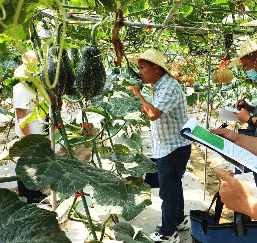 由于每個品類只能評選出1-2個品種,成為“專家推薦品種”,所以,初選后又進行一輪復評。復評時已臨近中午,棚內溫度接近40℃,每位都是汗流浹背,特別是福建省農業(yè)科學院研究員李大忠個子又高,老是頭撞棚架,但還是彎著腰認真觀察每一個品種,認真做好每一個品種的記錄;湖南省農科院蔬菜研究所研究員胡新軍為了確定一個南瓜推薦品種,在大棚內反復來回,比較又比較,真是認真又細心。他們這種負責的工作精神,讓筆者感動!